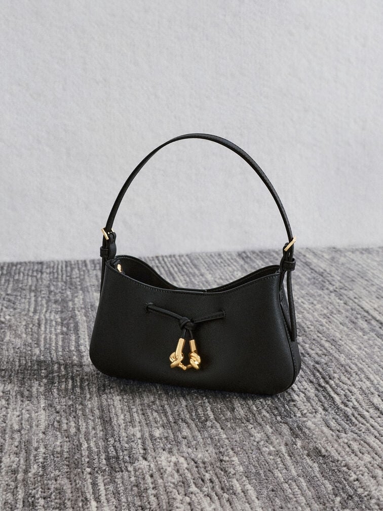 Chiếc túi đeo vai Mila màu đen này nổi bật với các chi tiết thắt nút kim loại và đường cong thanh lịch. Túi có hai dây đeo vai - một dây ngắn và một dây dài - cho phép bạn đeo theo nhiều cách khác nhau. Kết hợp với áo blazer dáng suông và chân váy xếp ly để có vẻ ngoài trang trọng, dễ dàng chuyển đổi từ công sở sang những bữa tối sau giờ làm việc.